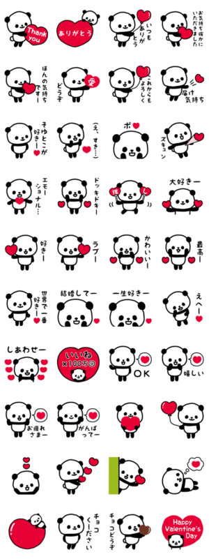手描きのゆるさがかわいい丸いおっとりパンダのシンプルスタンプ、大好き・感謝・ありがとう等の大切な気持ちが伝わるハートたっぷり編です。推し活にも、バレンタインにも