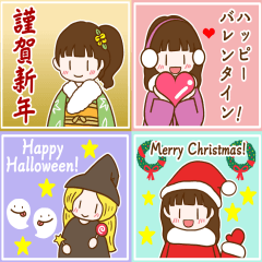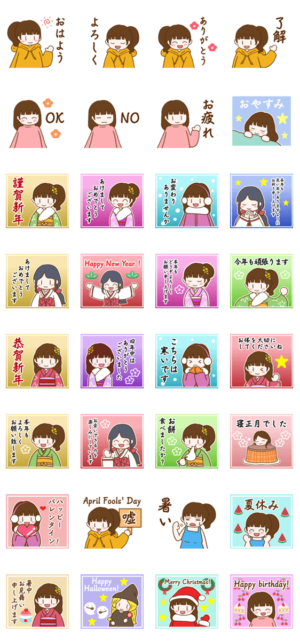 かわいい女の子の1年の行事と挨拶のスタンプです。お正月スタンプ多めです。謹賀新年/あけましておめでとう/バレンタイン/エイプリルフール/ハロウィン/クリスマス/誕生日