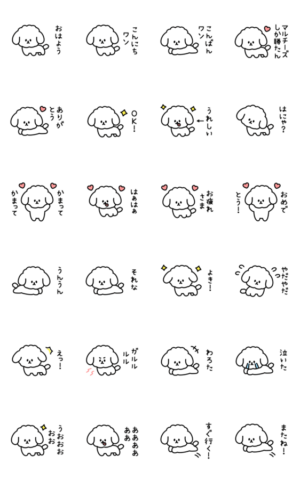 プルプル動くマルチーズのスタンプ。犬好きの方/犬派/まるちーず/まるぷー/マルプー/トイプー/白い/ふわふわ/もこもこ/小型犬/ちっちゃい/かわいい/動物/イヌ/わんちゃんじゃむばたチーズ より発売
