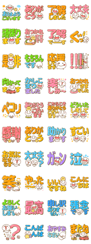 ゆるかわ♡棒人間のちびマロのとってもカラフルなデカ文字スタンプです。毎日使える言葉のセットです。ぴよたぬき より発売