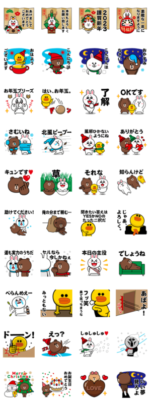 LINEのブラウンとコニーとサリーとムーンとチョコが登場。謹賀新年2023年・兎年(令和五年)のお正月・クリスマス・バレンタインに、毎日使える、日常会話の挨拶スタンプ。 ※BROWN & FRIENDS をみんなでつくろう!キャンペーン参加スタンプです4A-Studio(よんえーすたじお) より発売