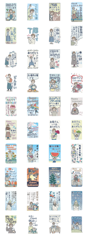 日常によく使う敬語と一年のイベントのご挨拶を大きなサイズで。年中行事/春夏秋冬/あけおめ/暑中見舞い/おめでとう/北欧/女の子/オシャレ/妖精(チャイ) ※このスタンプはトークルームで大きく表示されるBIGスタンプです。dokabasa歌劇団 より発売