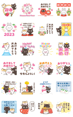 2023年の新年のご挨拶に使えるスタンプです。干支のウサギさんと「クロときどきミケ」とのコラボスタンプです♪