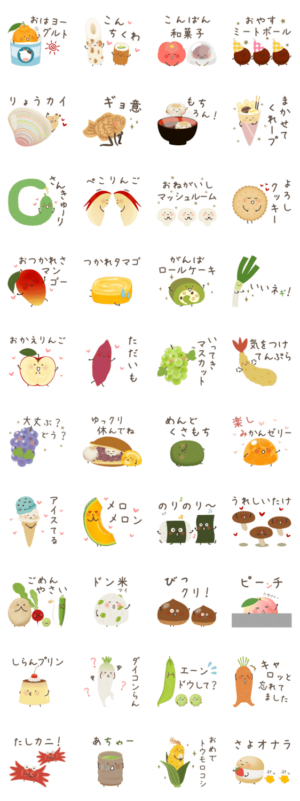 ゆるい食べ物たちの日常で使えるだじゃれスタンプです。クスッと笑えるかわいい食べ物たちです♡mamako より発売