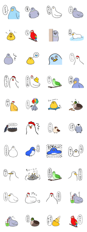 人間の言葉を真似る鳥たちのスタンプです。言葉の意味は理解していません。とり/トリかるめ より発売