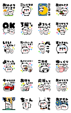 かわいいパンダとネズミのチューの年中使える敬語スタンプ♪毎日使える挨拶や返事がそろってます。背景が動くよー!前田ムサシ より発売
