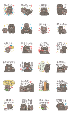 ツキノワグマの親子の、ため口・敬語・いろんな言い回しで様々なシチュエーションで使える便利な感謝のポップアップスタンプ♪