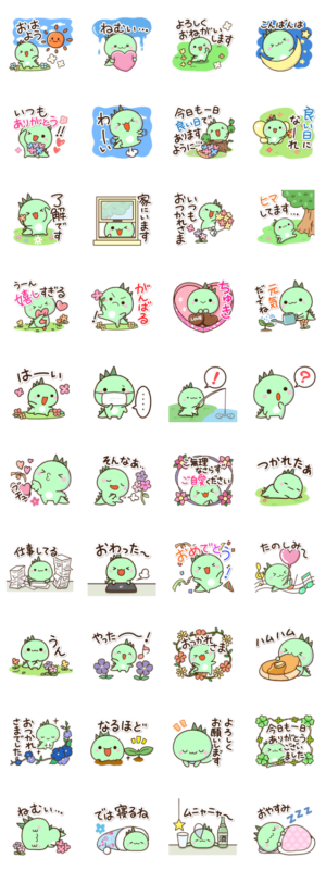 ちいさいモンスター『ちびもん』のかわいい、花多めのスタンプ。緑のカッパ色の怪獣。便利に使えるスタンプです。UMAや河童、恐竜、かいじゅう好きの方にぜひ。【かたこ】かたこ より発売