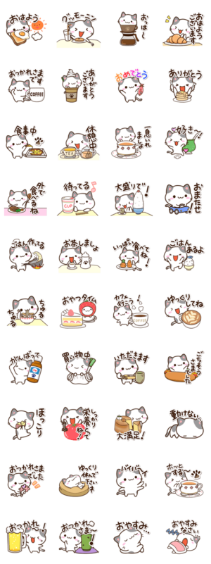 小さいブチ猫の、ごはんや家族連絡等に使えるスタンプ。よく使う言葉や、毎日使える文字を集めました。ぶちネコを飼っている方等、かわいいねこ好きな方にぜひ。【かたこ】