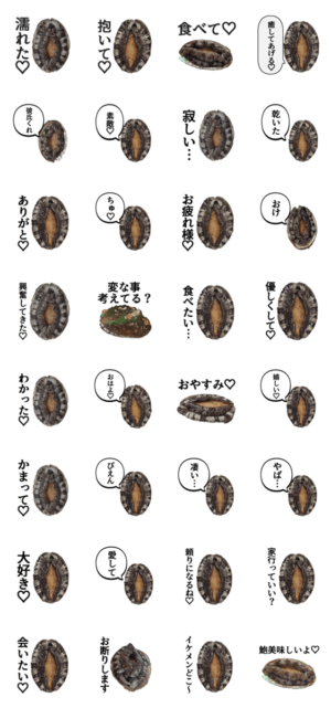 使いやすい鮑のスタンプです。愛情表現や構って欲しい時にぴったりです。カップルや彼氏彼女で使うのもおすすめします。貝/食べ物/あさり/ハマグリ/シュール/しじみ/サザエカボス太郎 より発売
