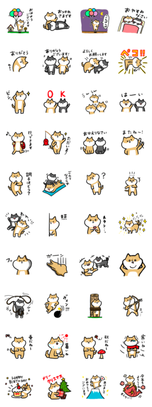 年中使える柴犬さんのスタンプです。仲良し黒柴コンビが可愛くシュール。お正月の挨拶や季節の言葉、ネタまで色々。犬好きさんにおススメです。まるぺ より発売