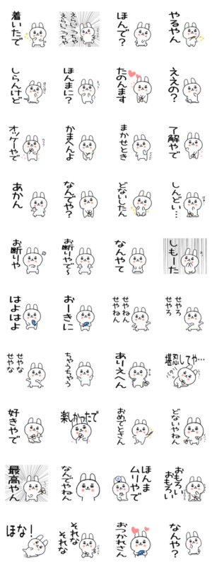 毎日使える日常会話スタンプです。しろまるいウサギキャラの関西弁スタンプ★かんさいべん★もるきゅた作もるきゅた より発売