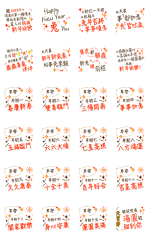 旧正月・春節の年賀状です。文字の温度、兎年正月から年十五日までの心を込めた祝福スタンプです。台湾、香港、澳門で使われる中国語繁体字。Tantan より発売