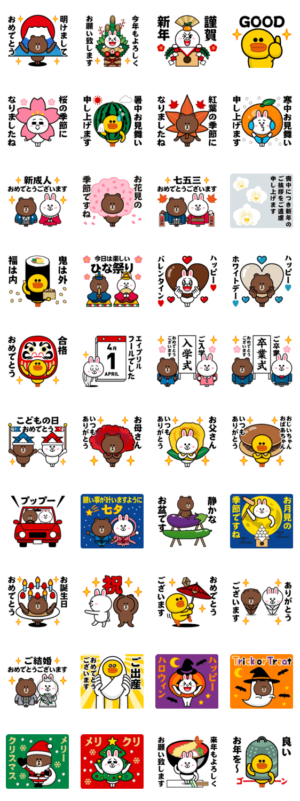 ブラウン・コニー・サリーが登場。季節行事の正月・バレンタイン・誕生日・クリスマス・ハロウィン・成人式・七夕・母の日・父の日・結婚・ひな祭り・七五三・喪中に使える ※BROWN & FRIENDS をみんなでつくろう!キャンペーン参加スタンプです4A-Studio(よんえーすたじお) より発売