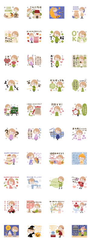 一年中使える定番大人可愛い敬語入りのガーリースタンプです。日常の挨拶や年間イベントを詰め込んだ基本のスタンプです。