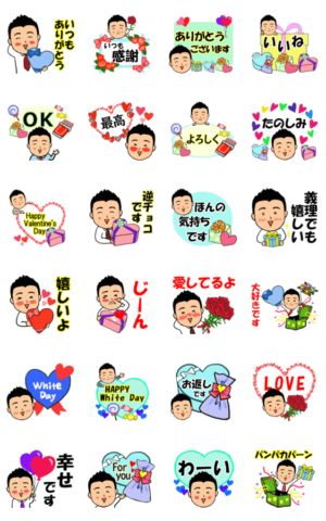 笑顔のサラリーマン【眼鏡無し】バージョン。見やすい文字挨拶付き。男性からも気持ちをスタンプで伝えよう♪彼氏、旦那、男性、ラブラブ、夫婦、愛妻、家族、ホワイトデー