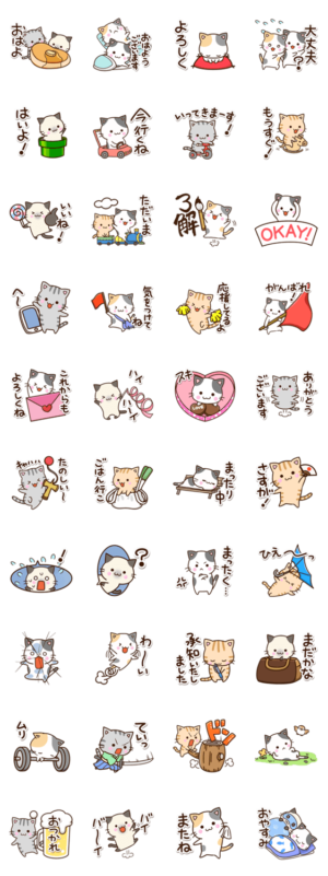 『おちゃめなネコたち』の、わちゃわちゃした、にぎやかスタンプ。三毛猫、トラねこ、ぶち猫等が登場。サバトラやアメショ、シャムネコ等の猫好きの方にもぜひ。【かたこ】