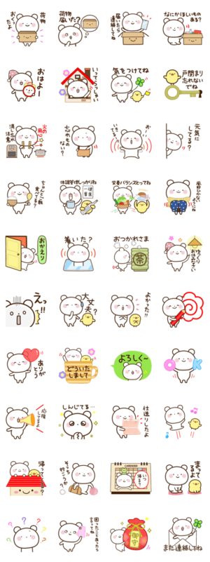 離れて暮らす家族に送るスタンプです。一人暮らしの大学生や、社会人、結婚して別居している子供、親、祖父、祖母、兄弟、親戚などへ。