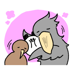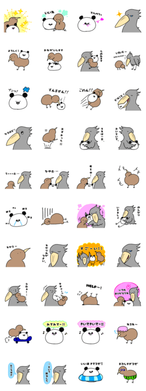 大福みたいなぱんだっぽい子とその友達、のんびり屋のハシビロコウと怖いもの知らずのキーウィのスタンプです。ゆっけ より発売