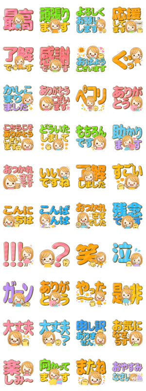 大人可愛い女の子のとってもカラフルなデカ文字スタンプです♡ よく使う挨拶とお返事・リアクションが入って気持ちの伝わる言葉のセットです。