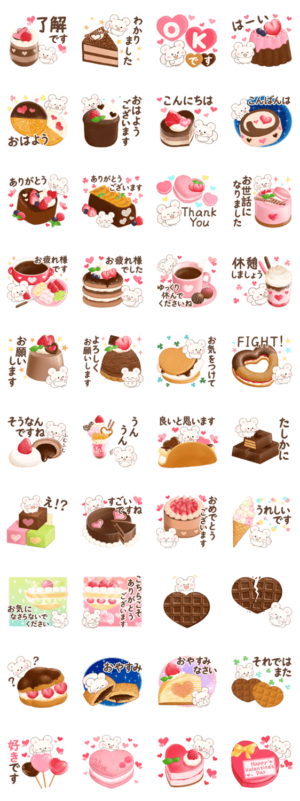 ハートとチョコレートたっぷりの可愛いスイーツとリス。 日常会話で役に立つ毎日使いやすい敬語メインのスタンプです。バレンタインにも。毛玉ピストル より発売