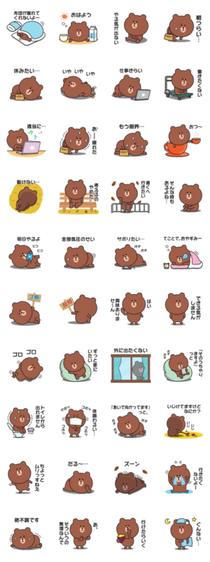 いつもやる気が出ないブラウンのスタンプです。 ※BROWN & FRIENDS をみんなでつくろう!キャンペーン参加スタンプですパン より発売