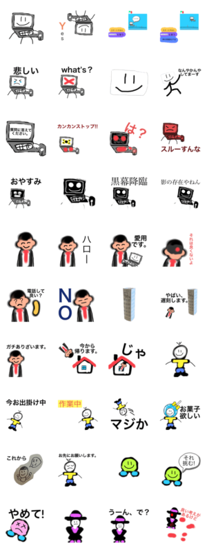 ゲーム会社のスタンプである。 上から順に、パソコン君、ごく普通だと思う会社員だと思う?残念。針 切男(はりきりお)さんやで。後、ミニ太郎と、ライバルと、ラスボス。