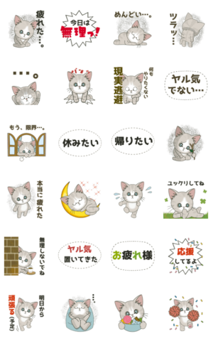 (疲れた/猫スタンプ/五月病/やる気がない/めんど/休み/休む/学校/職場/仕事/バイト/家事//現実逃避/頑張る/デカ文字/動く/可愛い/癒し)