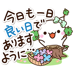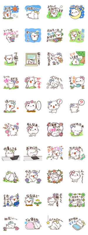 リボンをつけた小さい白猫の『ちびシロ』。おはようからおやすみまである便利なネコスタンプです。花や自然がいっぱいのかわいい白猫。しろねこ好きな方にぜひ。【かたこ】かたこ より発売