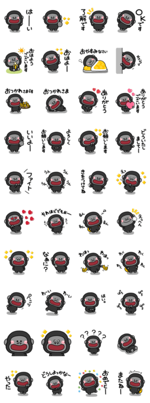 ゴリラのごりちゃんの毎日使える基本形スタンプです。使える内容を厳選し作成しました。【作:いしいともこ】