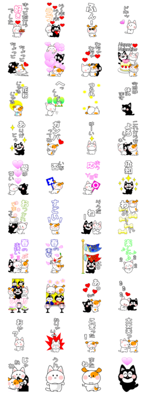 2匹の猫と1匹の犬の楽しくて毎日使えるラブ春なBIGスタンプです。ヴァレンタイン、ひな祭り、こいのぼりと共に。