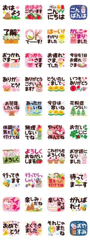 ちょっとだけ大人の、シンプルで見やすいデカ文字スタンプ。春にぴったり!日々のごあいさつ、花粉症、お祝い、母の日にも使えるほっこり便利なスタンプです♪