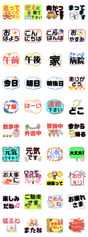 年配者、高齢者の方が使いやすい大きな文字。家族 友達に連絡や、相手を気遣うスタンプです。スマホ初心者の方へのスタンププレゼントにもどうぞ。(病院 迎え 挨拶)