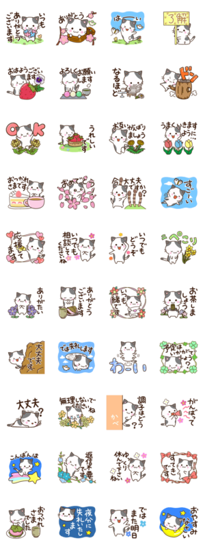 白とクロのブチねこスタンプです。「おはよう」から「おやすみ」までの基本的なあいさつから、毎日使う言葉もある、花いっぱいの便利な猫スタンプです。【かたこ】かたこ より発売