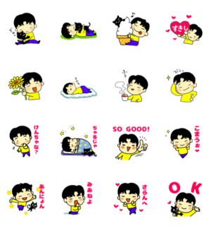 太陽のような笑顔が素敵な男の子のスタンプです(*^_^*)with黒猫ちゃんchobio より発売
