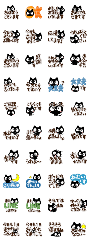 『クロネコすたんぷ』の絵文字と着せかえもあります!文字いっぱいに、一度に気持ちを伝えられるくろねこ。丁寧な言葉で送ることができる敬語黒猫スタンプです。【かたこ】
