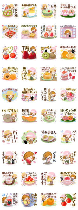 落ち着いた色合いで華やかな春の日常スタンプです♪おいしい春~初夏のたべものがいっぱい♡敬語で使う相手を選びません♪「ほのぼのカノジョ」シリーズ /桜/猫/くま/