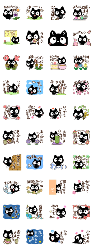 『クロネコすたんぷ』の絵文字と着せかえもあります!春らしい雰囲気の花いっぱいのくろねこスタンプ。丁寧な言葉や敬語で送ることができる黒猫スタンプです。【かたこ】