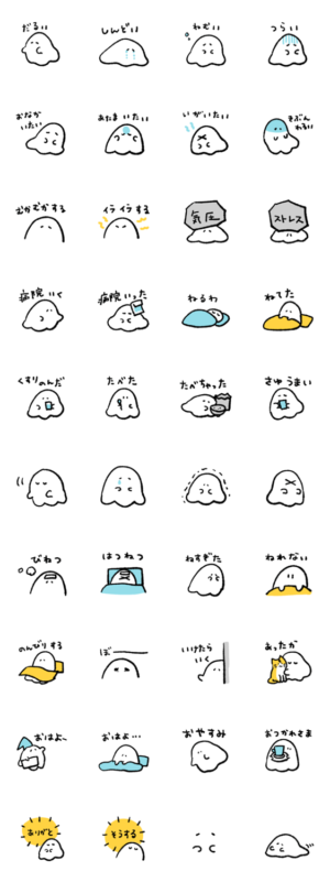 おばけちゃんの体調が悪いスタンプです。頭痛、腹痛、寝不足、疲労、ストレス、気圧、いろんなことに悩む病気・病弱な人が良くなりますように。ゆき より発売