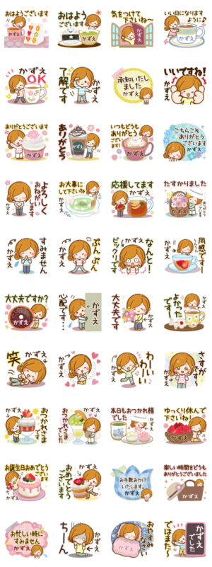 全国の「かずえ」さんが使う専用スタンプです☆使いやすい敬語とおいしそうな食べ物がいっぱい入った日常スタンプです♪/「ほのぼのカノジョ」作者ルルーの名前スタンプ