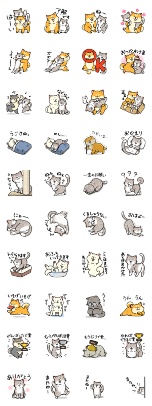 柴犬むちにねこのお友達ができました! 自由気ままで癒される、仲良しな柴犬と猫のスタンプです。ヨツバヒトミ より発売