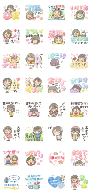 女の子のパステルカラーでか文字スタンプです。花粉症/ホワイトデー/ひな祭りかなぴ より発売