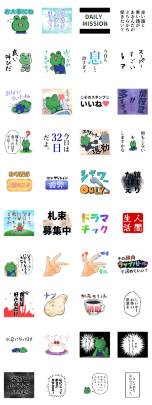 カエルと愉快な仲間達の日常の隙間の隙間で使えそうなスタンプです。様々なシチュエーションでお使いください!