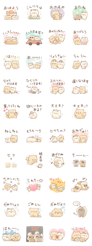 仲良しなミケとクリーム、けだまとこだまなスタンプです。家族連絡やご友人、恋人さんなど、幅広く使いやすい基本の言葉入りです。ぽち より発売