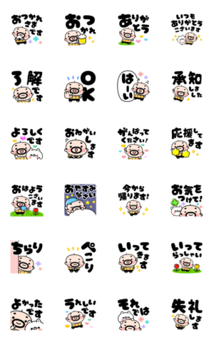 おやじ君と猫のタマチンのでか文字敬語スタンプ。春・新年度にも使いやす丁寧語。ビジネス/仕事/会社/ママ友/PTA/目上/シニア/感謝/気遣い