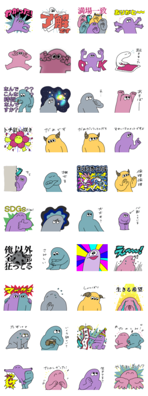 愉快で楽しいおばけが集合する素敵なスタンプです。個性が光ります。
