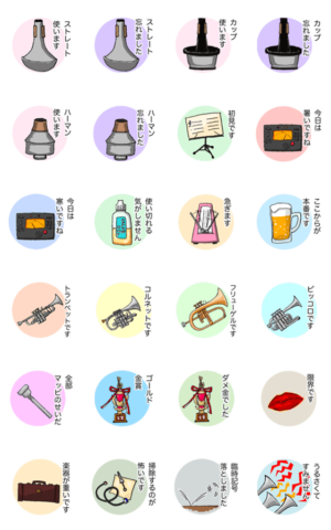 吹奏楽部、吹奏楽団でトランペットやコルネットを吹いているアナタの為のスタンプです! もちろん、他パートの方もバシバシ使ってね♪ちゃぱん より発売