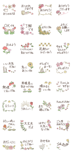 かわいすぎないことを意識した大人女子にかわいいスタンプ。日常でまいにち反射で使えるあいさつと花粉や寒暖差を気遣う言葉が多め。明るい気持ちになれる春の花が多いです