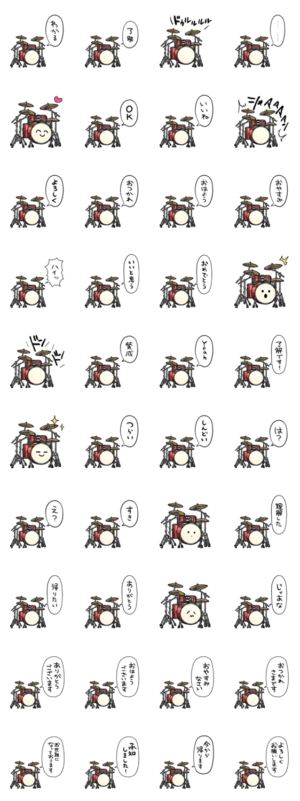 しゃべる楽器シリーズのドラムのスタンプです。ドラマーや音楽バンド好きな方にどうぞ。シンプルな日常あいさつや敬語もあるので友達家族仕事上司先輩なんでもどうぞ。オカヤマ より発売