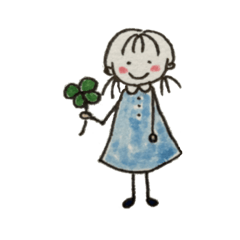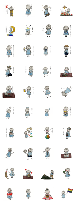よく使うあいさつなどに、主に水色のワンピースのゆるい女の子を描きましたarisa より発売